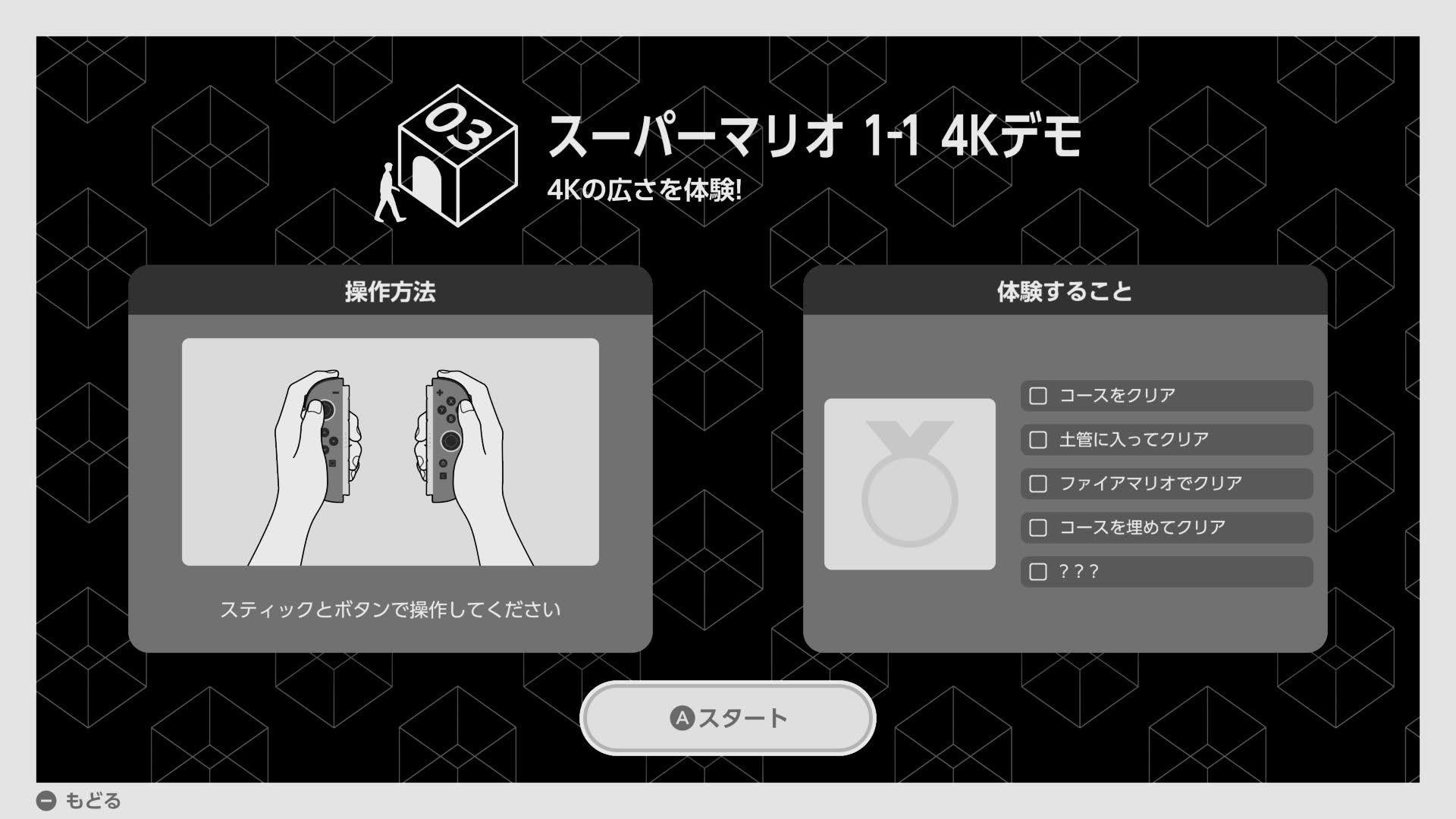 実際に4Kで出力されているのかを確認したい場合「ニンテンドースイッチ2のひみつ展」の【B: Nintendo Switch 2 本体エリア】まで進めてください。そこに「スーパーマリオ 1−1 4Kデモ」があります。4K60fpsで出力されている場合は問題なく遊べますが・・・そうでない場合はスーパーマリオ 1−1 4Kデモでこんな画面出てきます。