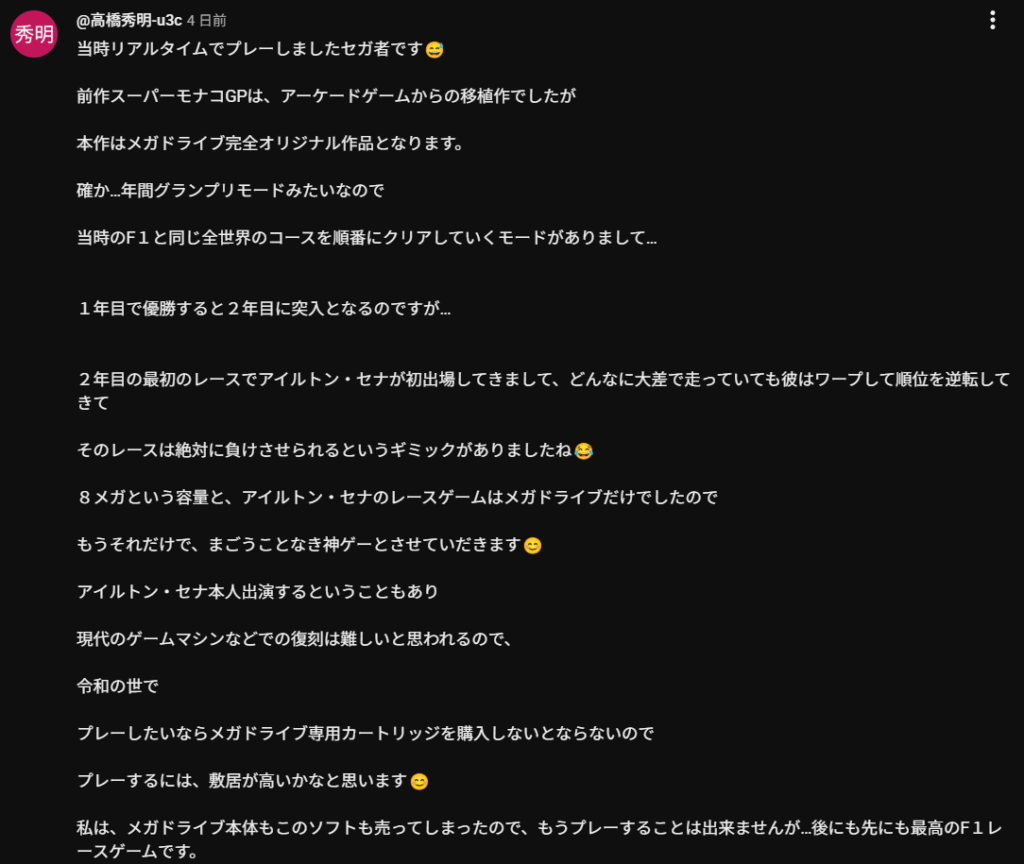 コメントにゲームに対する熱い気持ちが込められていて思わず取り上げてしまいました。