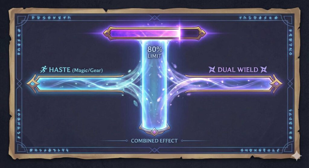 • ヘイスト枠のキャップ:魔法枠は約44%、装備枠は25%。合計で約68.75%まで短縮可能。
