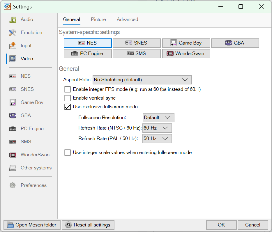 - 「General」タブ内にある「Use exclusive fullscreen mode」(または類似の項目)を探してチェックを入れる