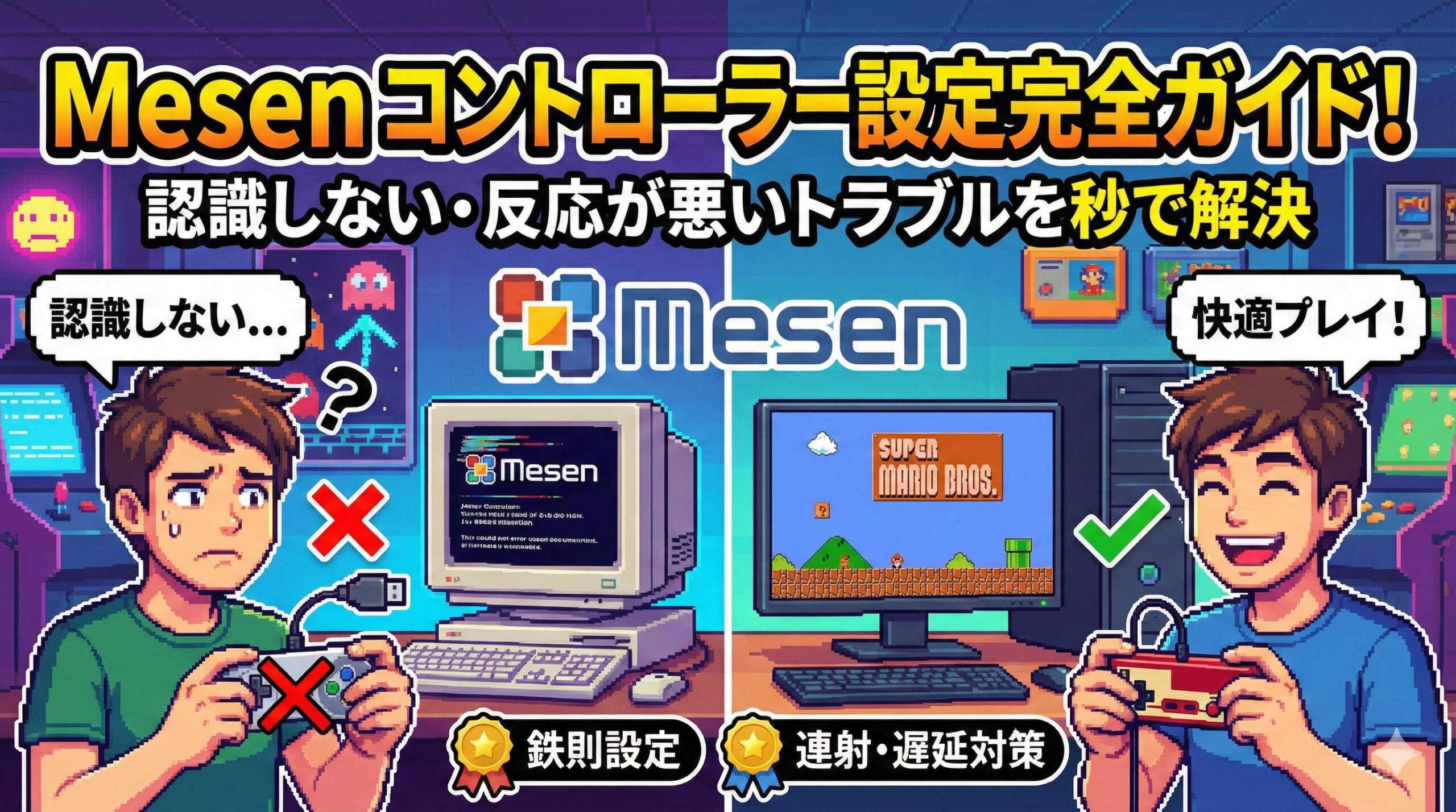 安心してください。この記事を読めば、Mesenでコントローラーが認識しないトラブルの9割は解決します。さらに、連射設定や遅延対策など、もっと快適に遊ぶためのテクニックも紹介します。