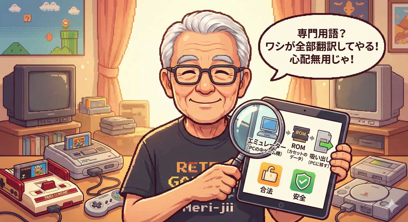この記事では、エミュ歴10年以上のワシ「メリ爺」が、初心者がつまずく用語を「必ず翻訳」しながら解説します。さらに、真面目な大人が気になる「違法にならない安全なライン」も、できる限り分かりやすく整理します。