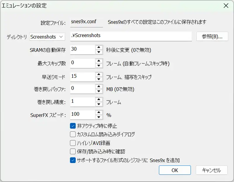 日本語版Snes9xでの設定はシンプルですが、少しだけ注意点があります。「ON/OFFのスイッチ」が存在せず、「数値を変更する」ことで機能が有効になるという点です。