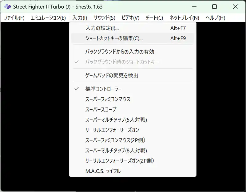 まずはSnes9xを起動し、メニューの構造を確認します。本記事では日本語化された1.63系をベースに解説します。