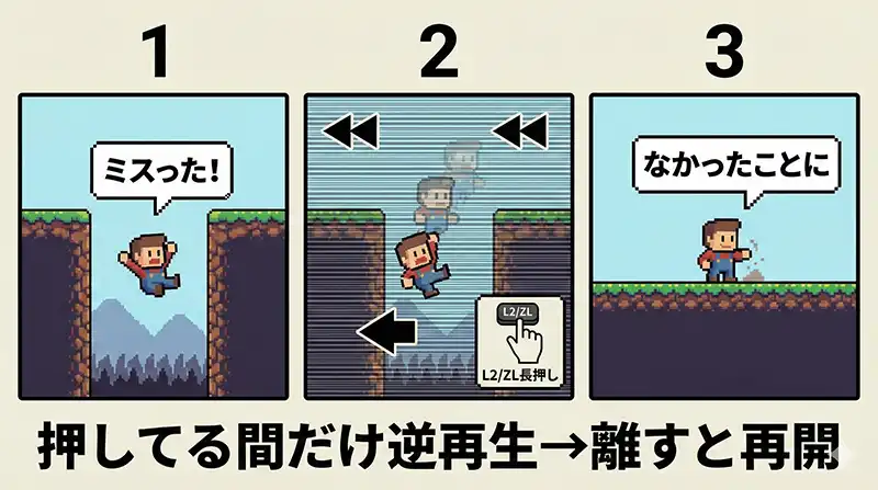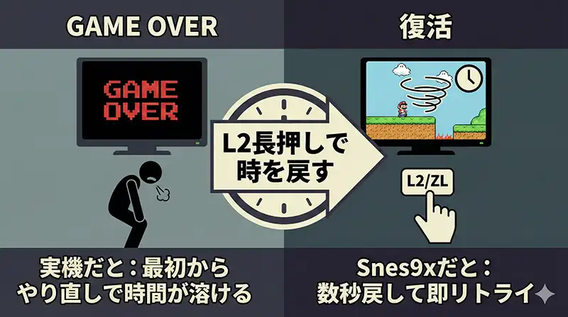 実機派の方が「エミュは邪道」と感じる理由の一つに、「こまめにセーブして、失敗したらロードする作業感」があります。確かに、いちいちメニューを開いてロードするのは没入感を削ぎます。ですが、巻き戻しは挙動がまるで違います。