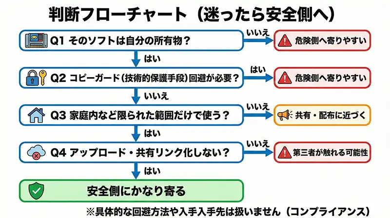 逆に、危険側へ寄りやすいのは、共有・配布・入手経路・コピーガード(技術的保護手段)回避・第三者介入に近づいた瞬間です。