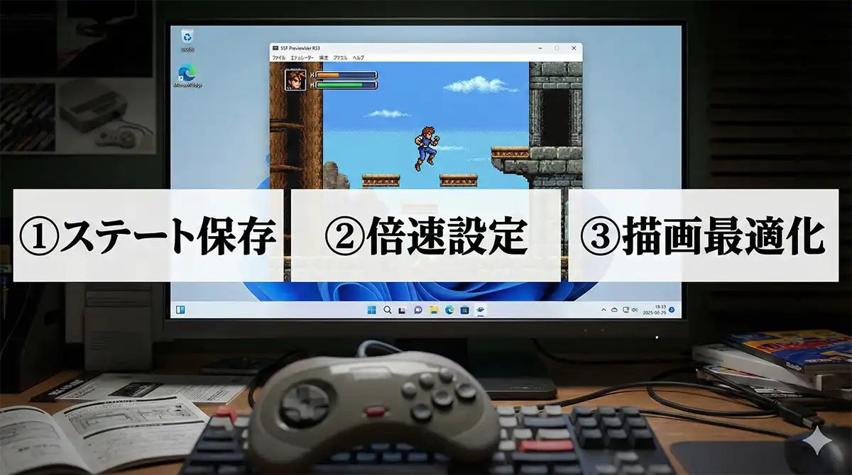ステートセーブは、ゲーム内セーブポイントに関係なく“その瞬間”を保存できます。短時間プレイの積み重ねや、ボス前のやり直しで本領発揮します。
