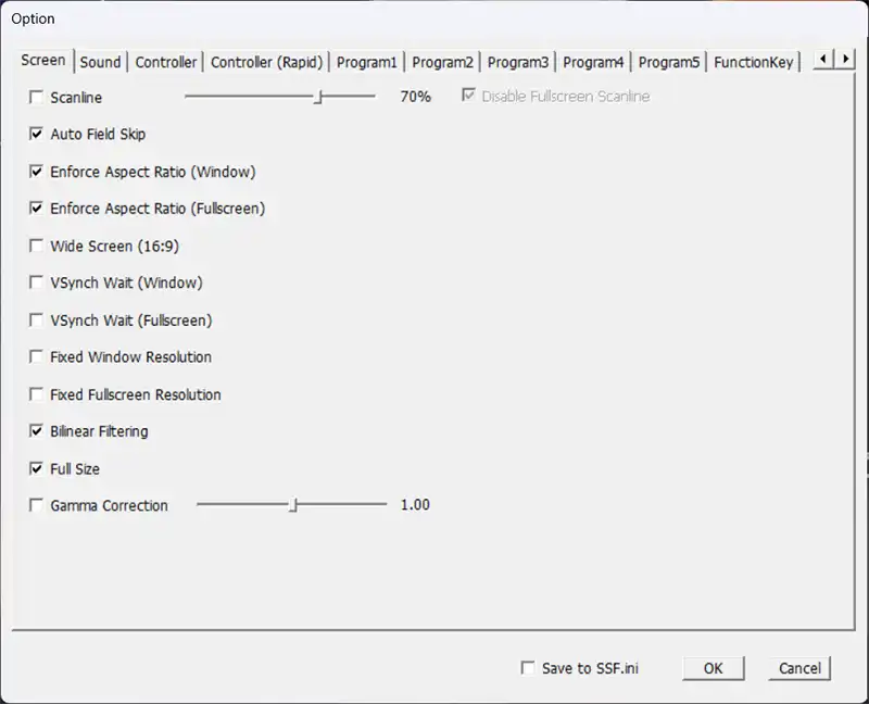 描画の要点はScreenタブに集約されます。Scanline / Bilinear / Aspect関連はここから触れます。