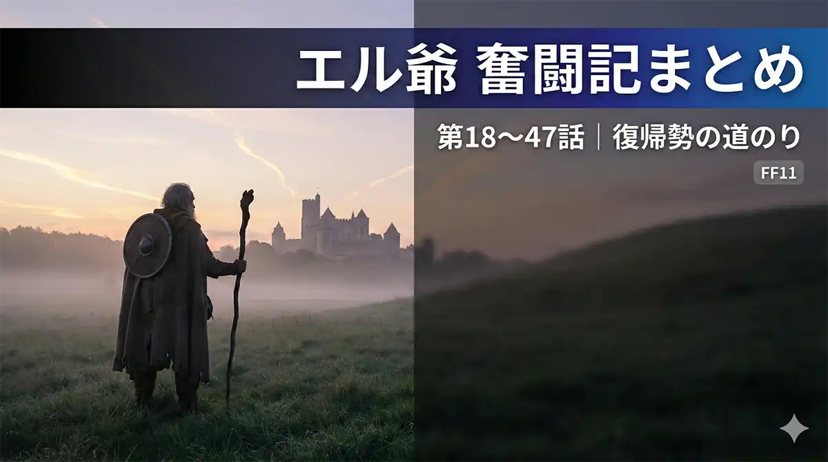 このシリーズ(エル爺奮闘記 第18〜47話)は、青魔道士のラーニングから始まり、限界突破→Lv99→アイテムレベル(IL)、さらにミッション/アサルト/ナイズルへと、少しずつ“できること”が増えていく流れが魅力です。