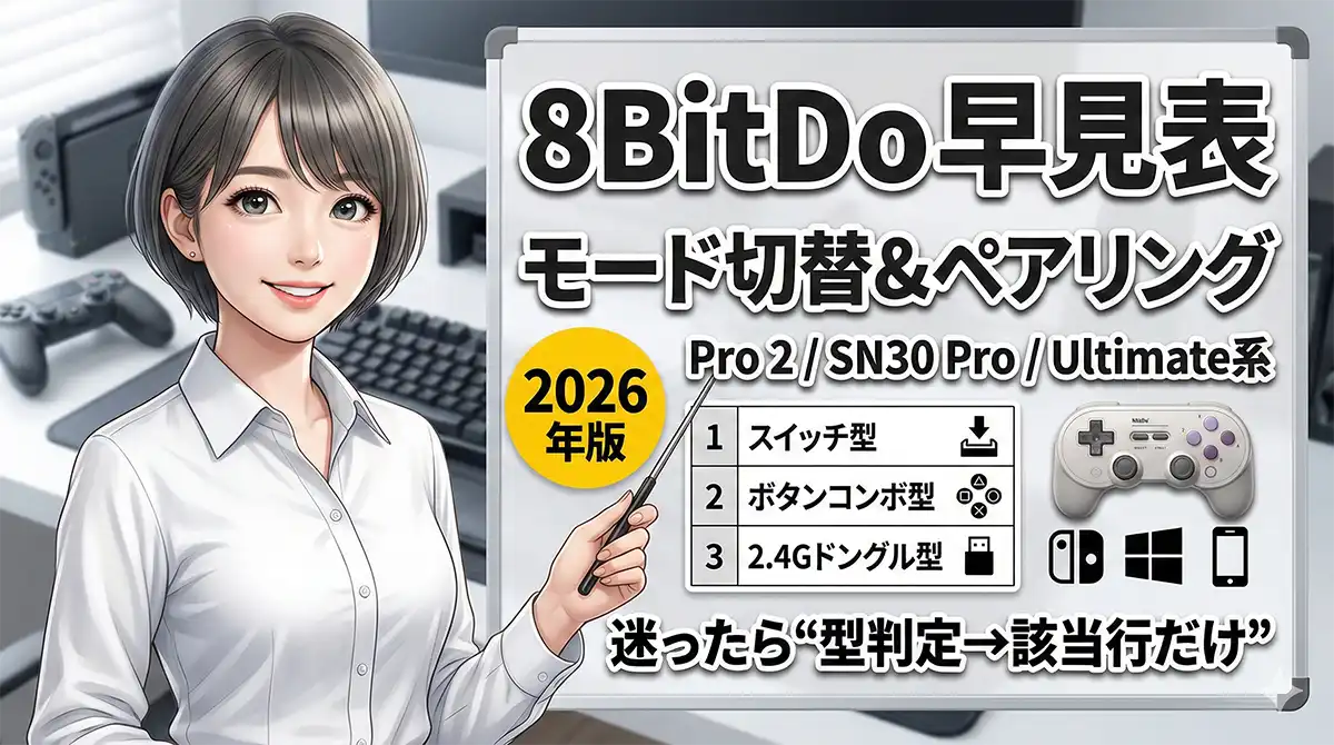 8BitDoは同じように見えるコントローラーでも、背面スイッチ型/ボタンコンボ型/2.4Gレシーバー型で操作がまったく変わります。適当にボタンを押すと沼ります。まずは自分の機種の「切替方式」を特定して、表の該当行だけ見てください。